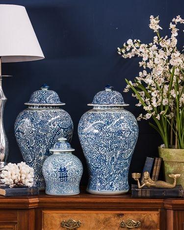 The ginger jars on her mantel and built-ins were another helpful piece to consider. Ginger jars in bright clean blue and white are a classic colour combo, like these: